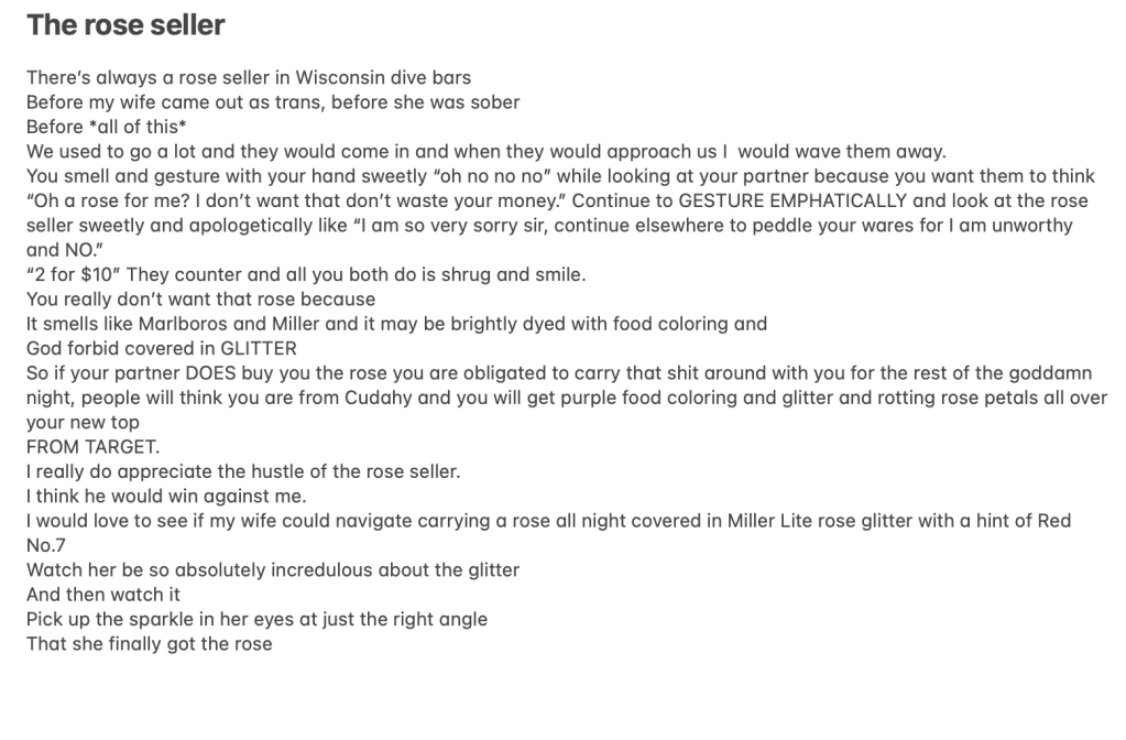 Past the smokers and the rose seller